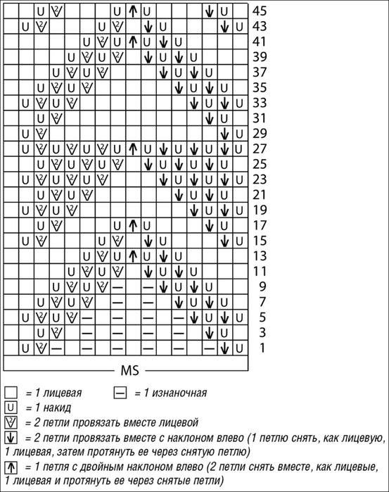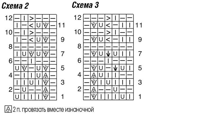 Количество петель кратно 10 + 1 + 2 кром. Вязать по схеме 1. На схеме даны лицевые и изнаночные ряды. В ширину начинать с кром., постоянно повторять раппорт, заканчивать петлей после раппорта и кром. В высоту вязать 1 раз с 1-го по 12-й ряды.