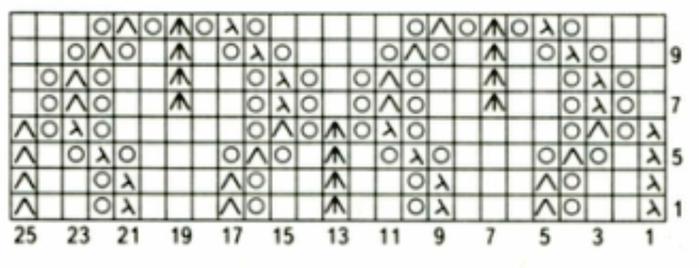 Набрать 51 п. в 1 нить на спицы №2.5, вязать 4 р. платочной вязкой, далее следующим узором до высоты 19 см.