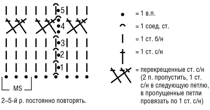 Вязать круговыми рядами по схеме. Круговые ряды начинать и заканчивать, как показано на схеме. Раппорт постоянно повторять. С 1-го по 5-й круг.р. провязать 1 раз, затем 2–5-й круг.р. постоянно повторять.