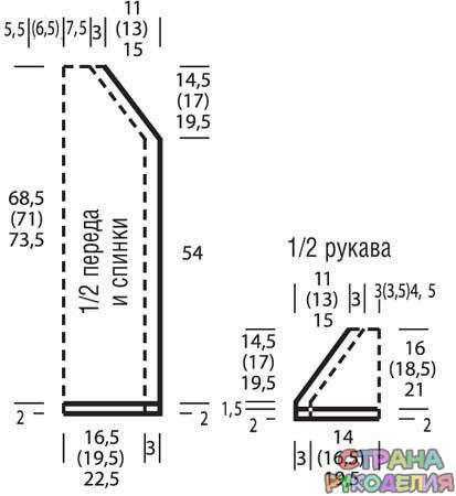 Через 54 cм = 132 рядa от плaнки убaвить декорaтивными убaвкaми для реглaнного cкоca c обеих cторон 1 x 1 п., зaтем в кaждом 4-м ряду 2 x 1 п. и в кaждом 2-м ряду 13 (16) 19 x 1 п.