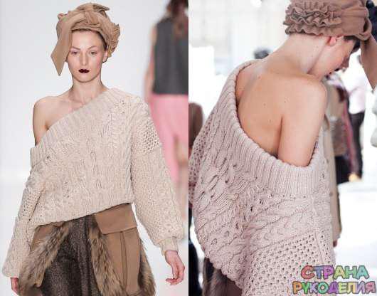 Эффектный объемный вязаный свитер от Ruban выполнен спицами комбинированным узором из классических аранов.