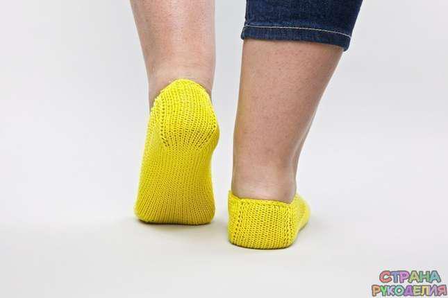 Теперь нанизываем петли с боковых сторон тапочка и вяжем одним полотном до начала пятки,осталось связать пятку тапочка,средние 9 петель в работе, начинаем убавление с двух сторон,как мы вяжем пятку.