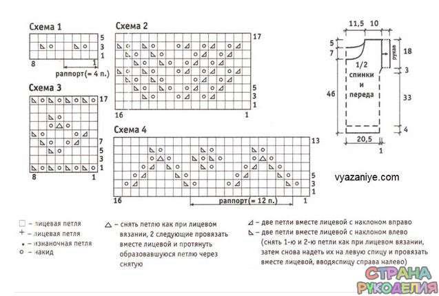 Последовательно чередовать ажурные полосы: по 18 рядов узоров по схемам 1 - 3 и 14 рядов схемы 4, после каждой полосы узора выполнять «рубчик».