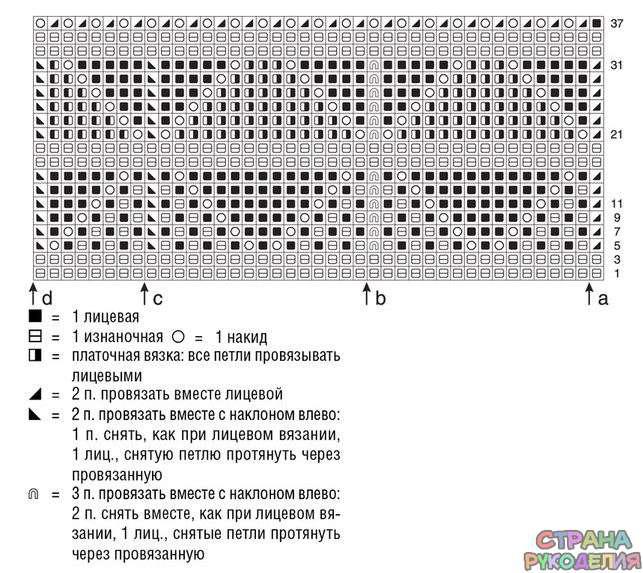 Вязать по приведенной схеме. Раппорт между стрелками а и b = 16 п. распределить по описанию в инструкции.