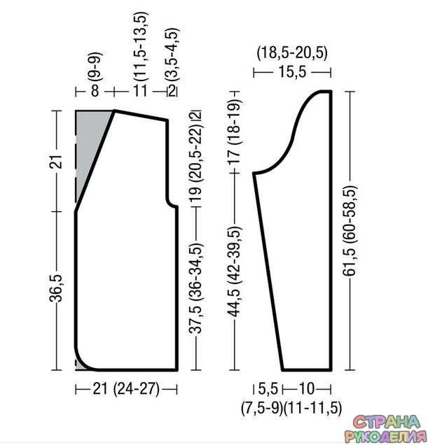 Для оката через 11 (8,5) 6 см = 38 (28) 20 р. от начала узора в сеточку с обеих сторон закрыть 1 х 5 п., затем в каждом 2-м р. закрыть 1 х 3 п., 18 (22) 26 х 1 п. и 3 х 2 п. = 24 (34) 42 п.