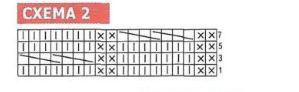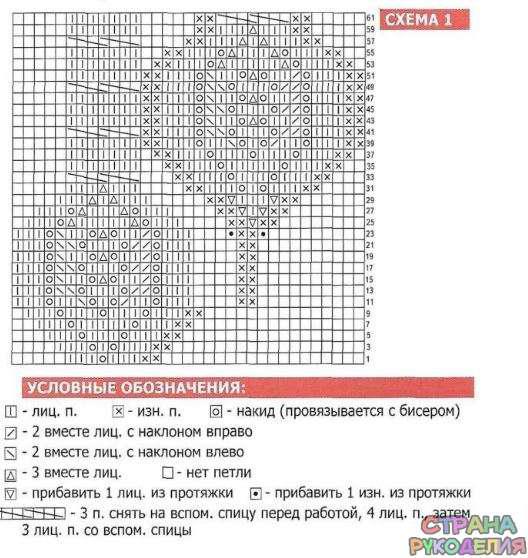 На схеме приведены лиц. ряды. Накиды провязывать с бисером след, образом: про-зязать петлю перед наки-дом, продвинуть 1 бусинку вплотную к правой спице, сделать накид, провязать петлю после накида. В изн. рядах - вязать по рисунку, над накидами вязать изн. п. так, чтобы бисер оставался на лицевой стороне вязания; узор из кос - вязать по кругу по схеме 2. В изн. рядах -все петли по рисунку.