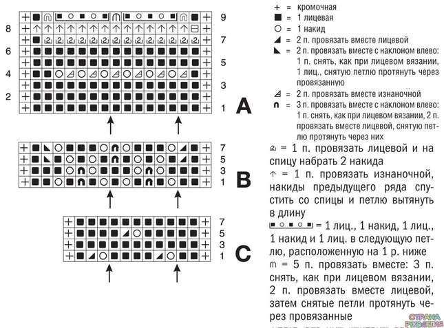 Вязать по схеме А. Начать 3 п. перед 1-й стрелкой, постоянно повторять раппорт = 6 п. между стрелками и закончить 8 п. после 2-й стрелки. Ряды распределить по описанию в инструкции.