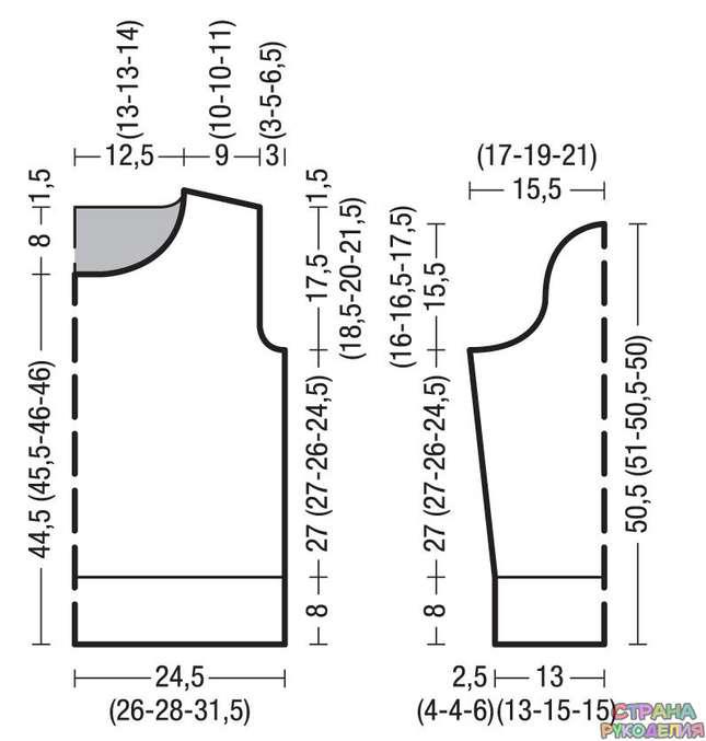 Мерки на схемах выкройки рассчитаны по образцу плотности вязания и относятся к лежащим на горизонтальной поверхности деталям модели.