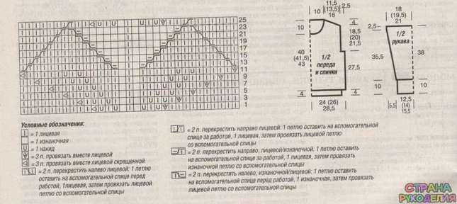 УЗОР «ЛИСТЬЯ»(НА 31 ПЕТЛЕ}: вязать по схеме вязания. На ней даны лицевые ряды. В изнаночных рядах петли провязывать по рисунку, накиды вязать изнаночными. 1-26-й ряды провязать 1 раз, затем 3-26-й ряды постоянно повторять.