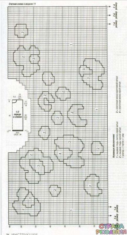 Светло-серой нитью набрать 84 (92) 100 петель на спицы № 4,5 и для планки связать 1,5 см = 6 рядов узором 3. Продолжить работу на спицах № 5 узором 4. Через 35 см = 128 рядов от планки вязать далее узором 5. Через 67 см = 210 рядов от планки закрыть петли, при этом средние 34 п. образуют горловину, внешние 25 (29) 33 п. плечи.