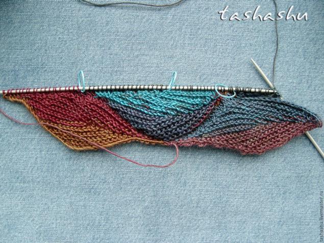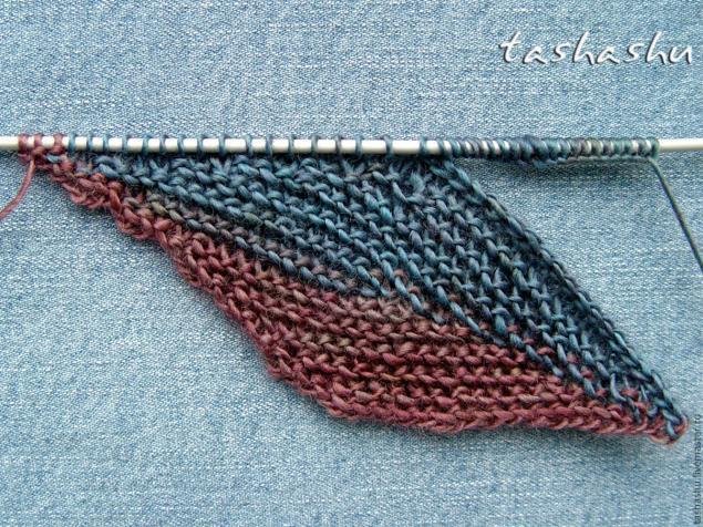 Не переворачивая вязания (изнаночная сторона) провязываем изнаночными еще 15 петель, переворачиваем. Теперь у нас на правой спице оставляем 25 петель. Их не трогаем, вяжем листик на средних 35 петлях. Повторяем схему, начиная со 2 ряда: