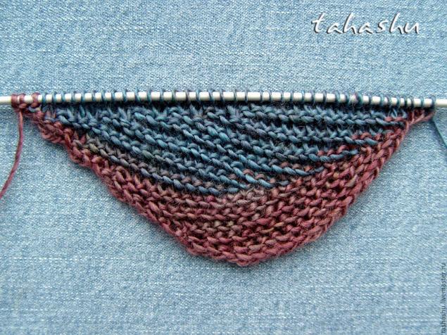 1р: кром, 34 лицевыми, поворачиваем вязание (тут и далее вязание поворачиваем, обернув рабочей нитью следующую, непровязанную петлю. Здесь это 36-я). Т.е., после поворота, на правой спице у нас получилось 4 непровязанные петли + 1 непровязанная, обернутая рабочей нитью), а на левой 35.