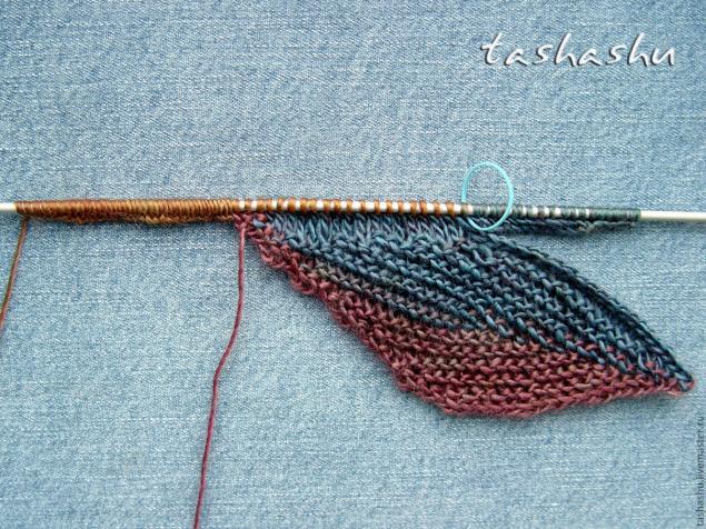 Вяжем следующий ряд лицевыми до конца и набираем для бокового листика еще 40 петель: