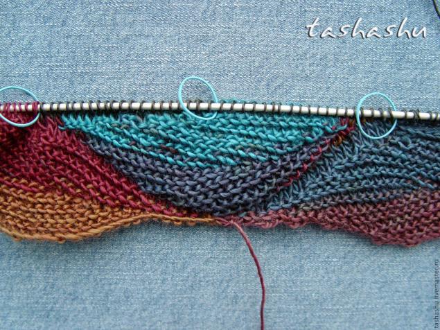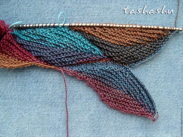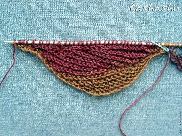 Когда вы поймете принцип — можно уйти от геометрии и произвольно менять размеры и положение листиков. В этом случае обычно вяжут на круговых спицах с использованием маркеров. Я сделала проще: закрываю петли каждого листка, а петли для нового набираю из кромочных: