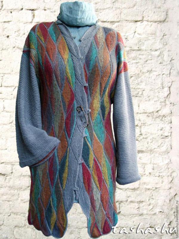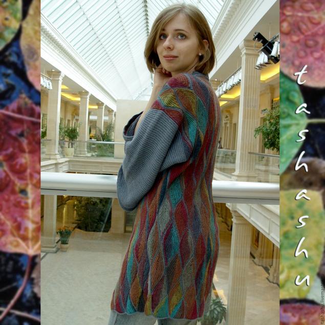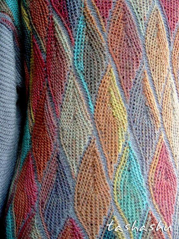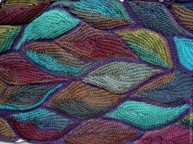 Невероятно красивый вязаный пэчворк «Осенние листья». Для этого рисунка подойдет и секционно окрашенная пряжа, и цветные остатки. Будем вязать полотно из элементов в форме листиков. Вязка чулочная.