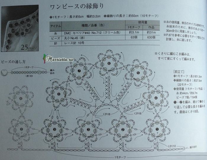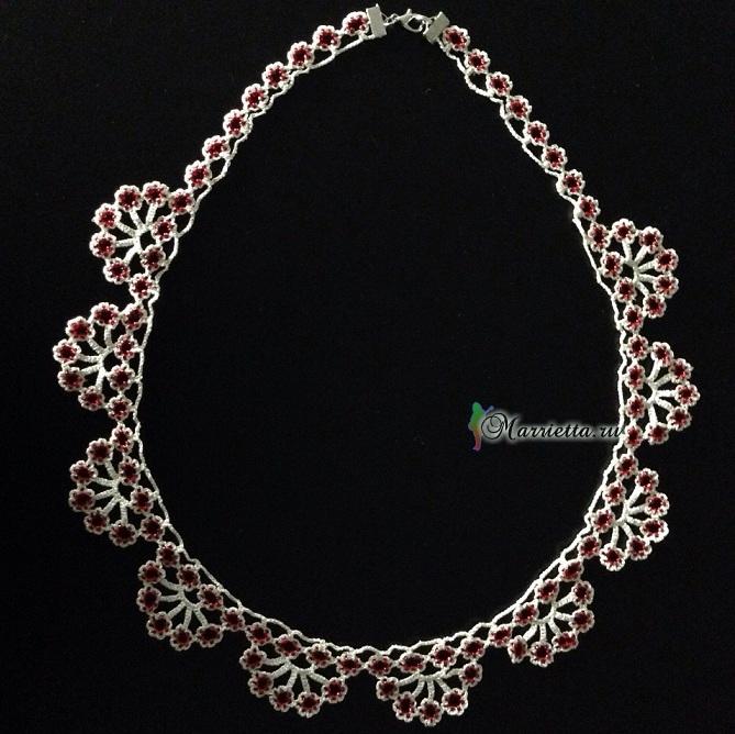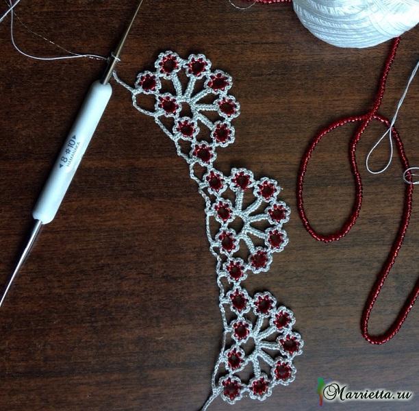 Красивое ожерелье связано крючком. В данном варианте использовано в качестве обвязки края горловины. Схему вязания смотрите ниже.
