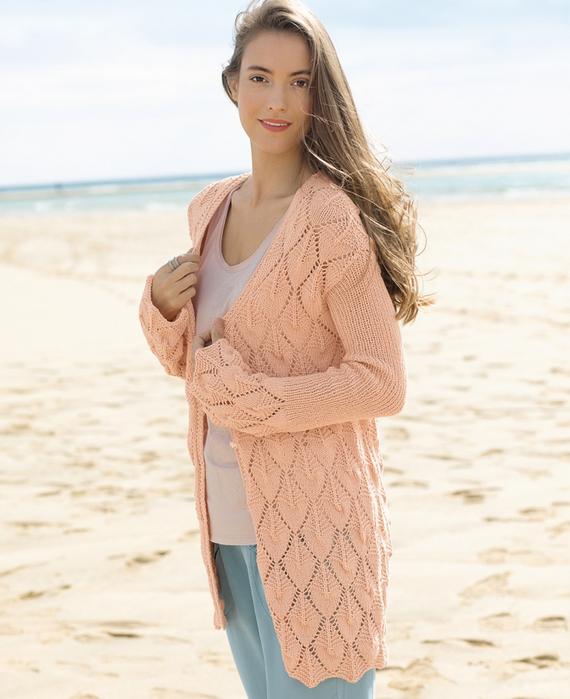 Узор из «листьев» украшает не только спинку и полочки, но и края рукавов этого кардигана длиной до середины бедра.