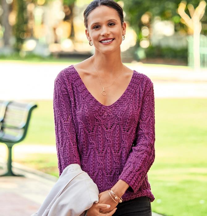 Изумительный пуловер цвета фуксии покоряет виртуозными узорами. Работа над ним будет непростой, но результат стоит затраченных усилий.