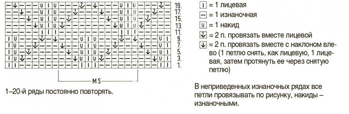19-й ряд: 1 изнаночная, * 2 п. провязать вместе лицевой, 3 изнаночные, 1 накид, 1 лицевая, 1 накид, 3 изнаночные, 2 п. провязать вместе с наклоном влево, 1 изнаночная, от * повторять.