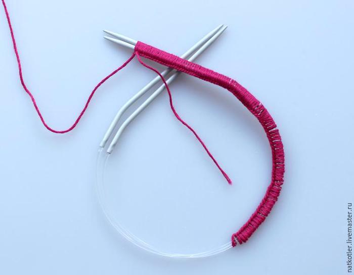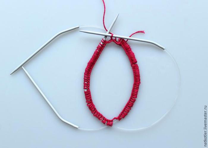 Соединяем петли в кольцо: дополнительную петлю со второй круговой спицы перебрасываем на первую круговую спицу.