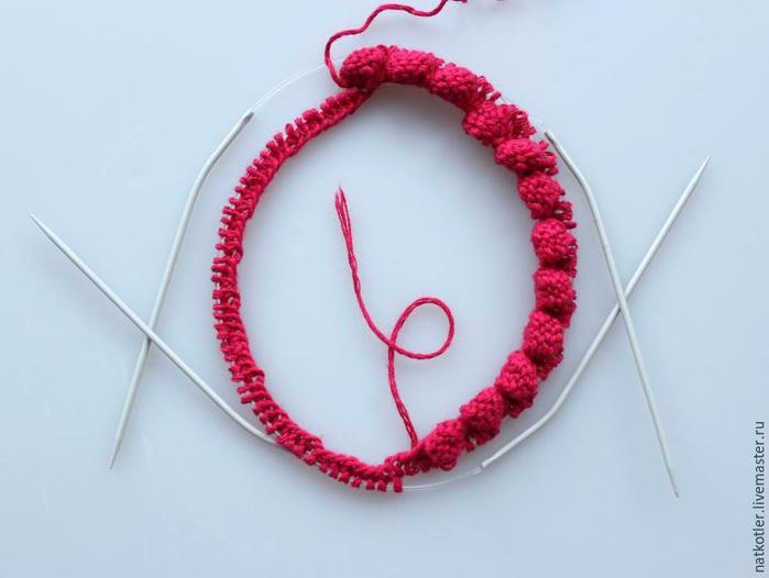 Второй круговой ряд – все петли лицевые. Третий ряд и ещё три ряда вяжем узором «Шишечки» по кругу на двух круговых спицах. Всего под носиком и ручкой получится 6 провязанных рядов, то есть три шишечки в высоту.