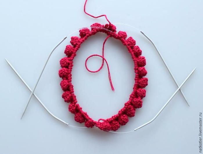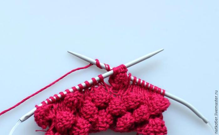 1 ряд (лицевая сторона): *из первой петли вывязать шишечку; 3 лиц; *повторять до конца ряда;