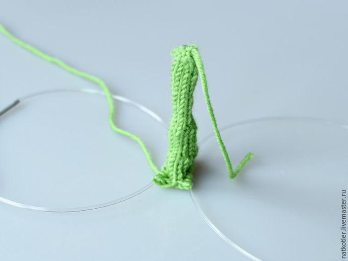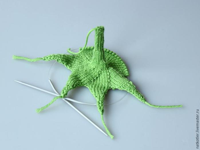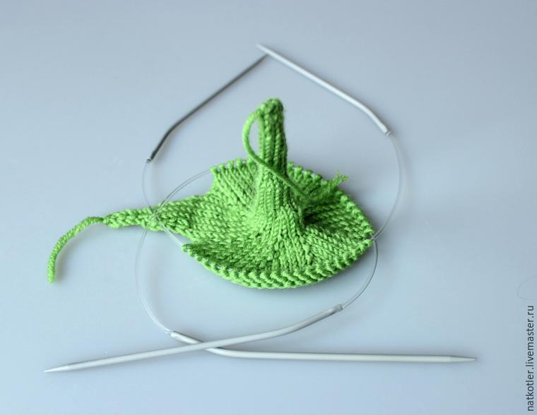 Теперь вывязываем каждый листик отдельно. Удобно вязать листики на 2 чулочных спицах.