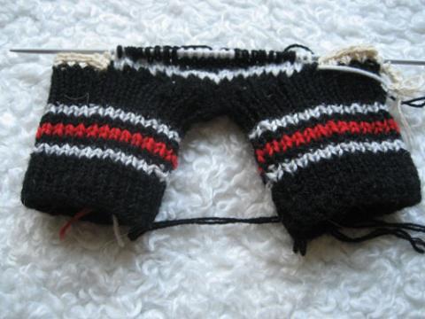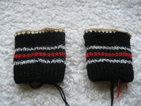 На каждой манжетке освобождаем по 2 петле и спицами №3,5 начинаем вязать лицевую сторону варежки, в каждом ряду прибавляя по 2 петли.от манжеты(начинаем с 2петель, в конце вязки на спицах должно быть 50 петель-половина варежки.