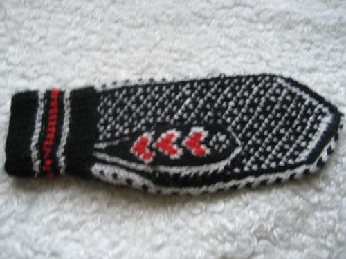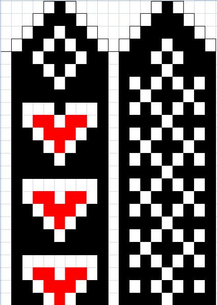 Рисунок красной нитью вышиваем аккуратно по петелькам, желательно не перекручивая нить, чтобы варежка была эластичной и легко растягивалась.