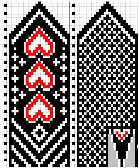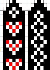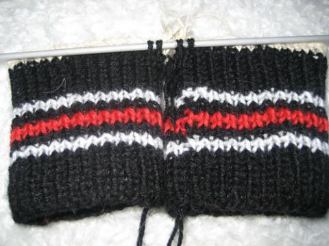 8рядов-чёрный, 2ряда-белый, 2ряда-чёрный, 2ряда-красный, 2ряда-чёрный, 2ряда-белый 8рядов-чёрный.. Всего 26 рядов. Закончила вспомогательной нитью, провязав 3 ряда.
