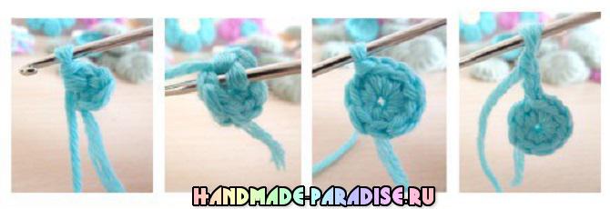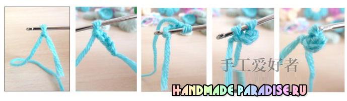 Вязание цветочка начинается с вязания цепочки из 5-ти воздушных петель. Цепочка соединяется в кольцо. Затем провязываются три петли подъема для перехода к вязанию следующего ряда витыми столбиками. Витые столбики состоят из 10-12 витков.