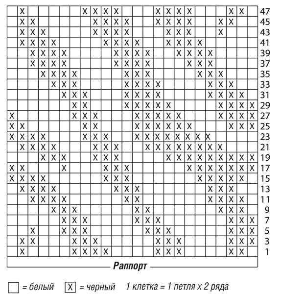 - Пряжа (70% шерсти ягненка альпака, 25% мериносовой шерсти, 5% полиамида; 160 м/25 г) – 175 (200) 225 г черной и 50 (50) 75 г белой; круговые спицы № 5;