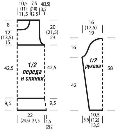 Одновременно прибавить для скоса рукава с обеих сторон в каждом 12-м ряду от начального ряда 8 x 1 п. и в каждом 8-м ряду 3 x 1 п. = 66 (72) 78 п.