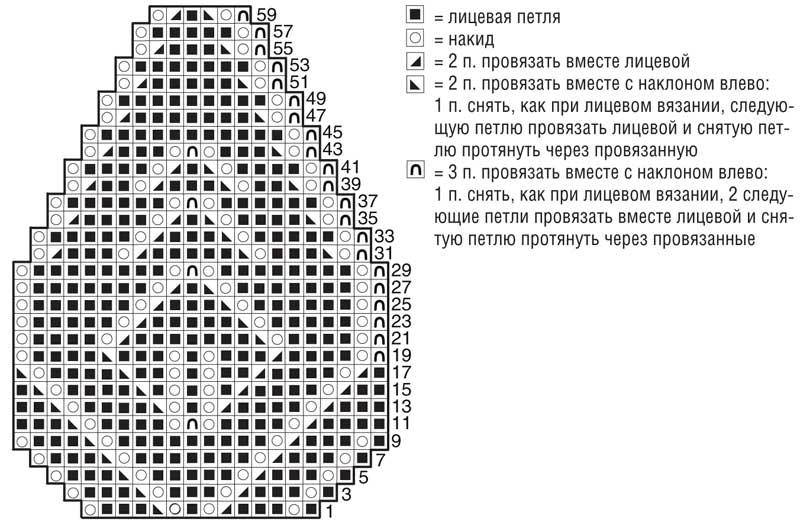 Вязать по кругу по приведенной схеме. На ней даны только нечетные ряды. В четных рядах все петли и накиды провязывать лицевыми.