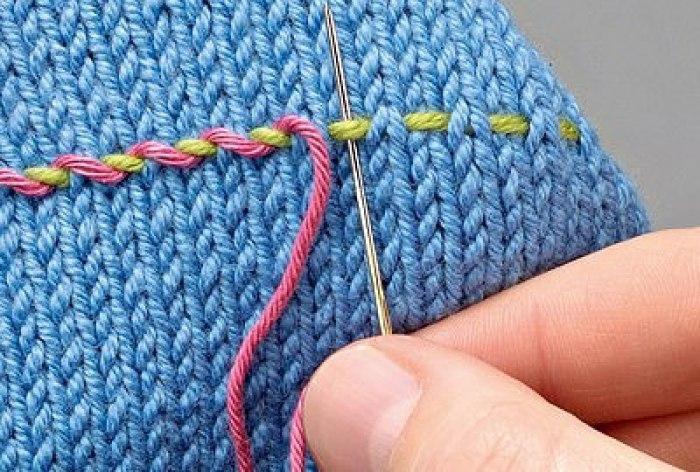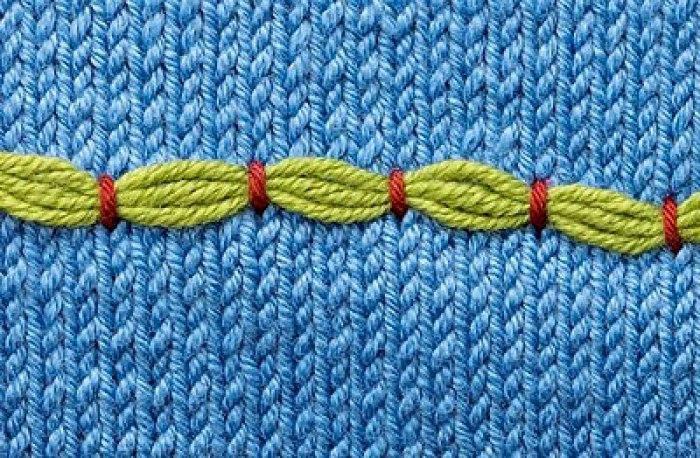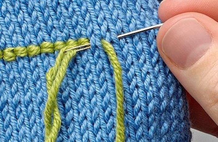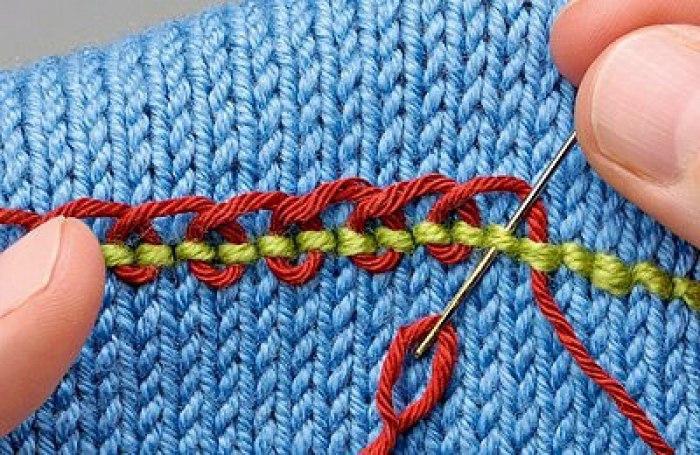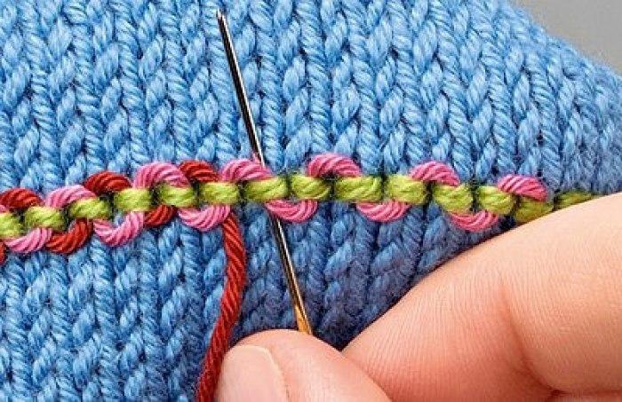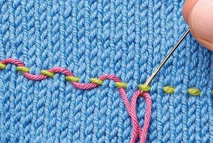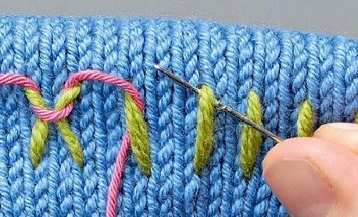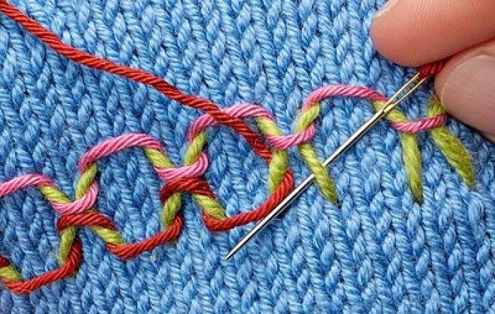 Основное правило гласит о том, что нить для такой вышивки должна быть равной по толщине той, которая использовалась для самого вязания. Если вы будете вышивать более тонкой нитью, то она не скроет нижнюю нитку вязания полностью, а вот очень толстая нить будет выглядеть грубо.