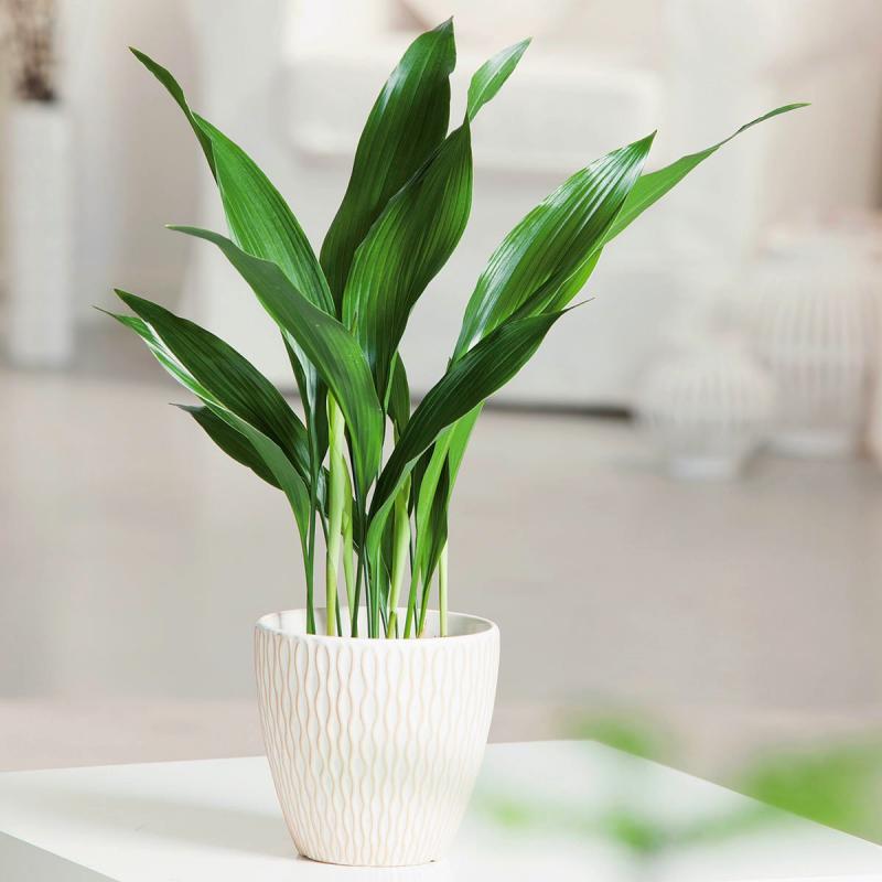 Одно из самых теневыносливых растений. Прекрасно очищает помещение от вредных примесей. В высоту листья растения достигают 55–60 см, в ширину — 10–15 см. Цветок аспидистры увидеть достаточно сложно, цветение попадает на летний сезон и длится всего один день.