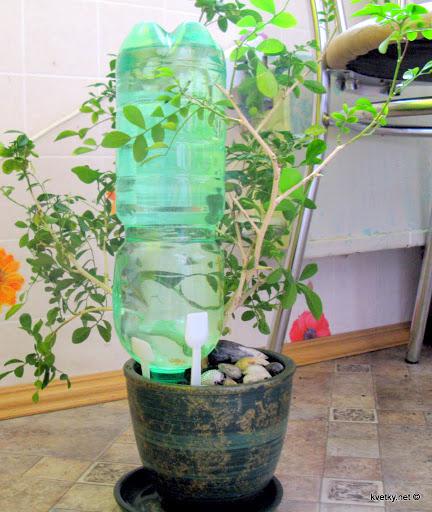 Берется пластиковая бутылочка, в зависимости от объема горшка, заполняется водой, в пробке делается маленькая дырочка (цыганской раскаленной иголкой), предварительно поливаете цветы и втыкаете в них бутылочки пробкой вниз. По мере высыхания грунта, цветок будет впитывать воду из бутылки. Неплохо с двух сторон закрепить ее палочками (например, от мороженного).