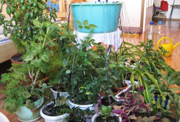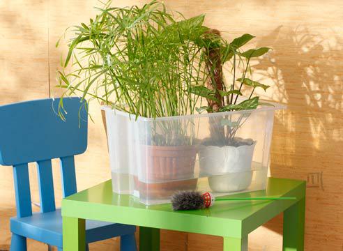 Постелите на кухонном столе пленку-клеенку (можно также поместить горшки в ванную, если растения не прихотливы к свету), на клеенку постелите смоченную в воде ткань (сукно, фетр, старое детское одеяльце, сложенный в несколько слоев ватин). На ткань поставьте горшки с уже политыми растениями, конец ткани нужно окунуть в емкость с водой. Горшки должны иметь дренажные отверстия, блюдца не нужны.