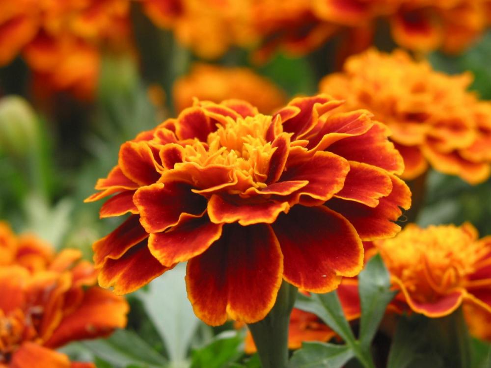 Бархатцы бывают гвоздикоцветные и хризантемовидные. Цветки ярко-жёлтые, оранжевые, лимонные… очень приятные и к тому же лечебные.