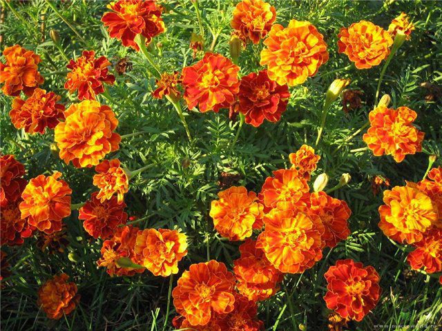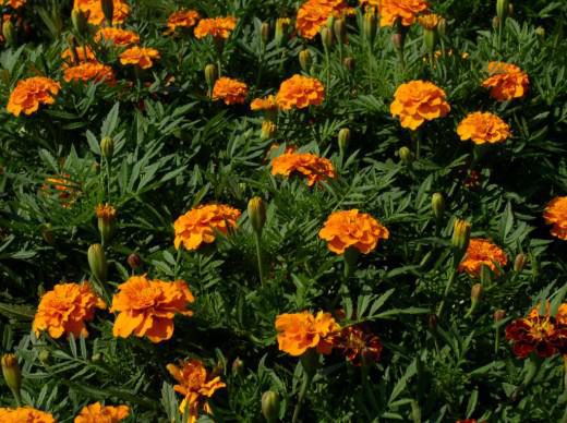 Для засаждения бордюров используют низкие сорта бархатцев. В зависимости от сорта растения достигают от 20 до 50 см высоты. Время цветения начинается в июне и продолжается до первых осенних холодов, цветы окрашены в желтый, оранжевый и красно-бурый цвета, часто с полосками или пятнами другого оттенка. Существуют сорта с простыми и махровыми цветами. Растение неплохо произрастает в условиях легкой полутени.