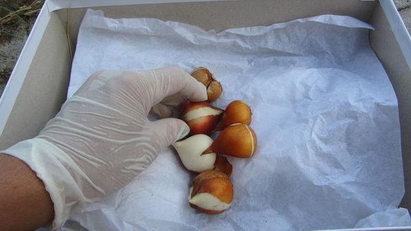 Выкопанные луковицы просушивают при температуре 25-30°C и относительной влажности 50% в течение 7-10 дней, после чего очищают от старых корней, чешуи и земли и сортируют. К первому сорту относятся луковицы диаметром 4 см и более, ко второму – 3-3,9 см, к третьему – 2,0-2,9.