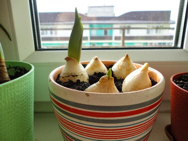 Когда побеги будут около 2,5-5 см, перемещают плошку с луковицами в комнату на 10-12°C, сначала притеняют, а через несколько дней их можно будет поставить на окно.