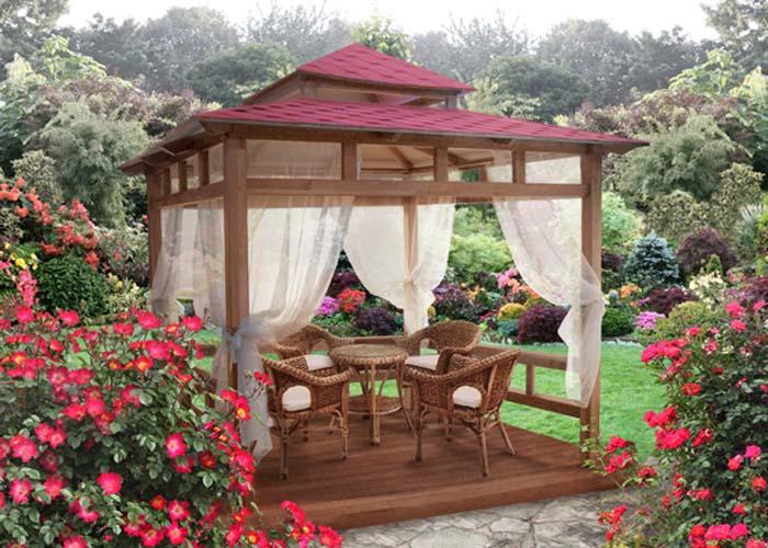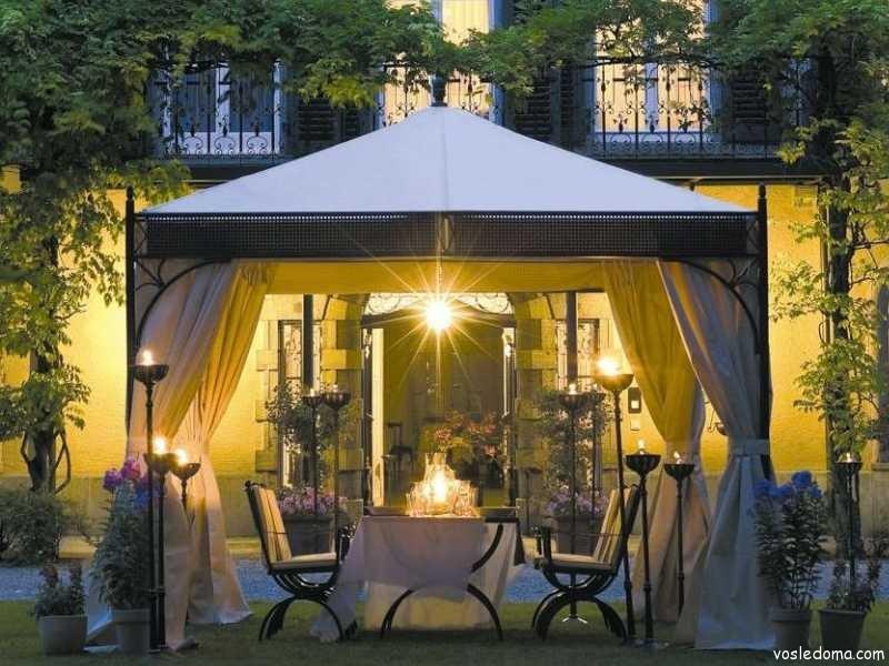 - Если в вашем саду уже есть готовая беседка, то непременно задумайтесь над обновлением тканей и дизайном драпировки. Если же такого сооружения еще нет, то есть возможность быстро создать экономичную и красивую альтернативу. Для этого необходимо установить четыре бруса или столба, между которыми протянуть веревки и подвесить шторы-драпировки.