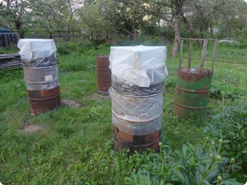 Но как бы хорошо ни наполнили бочку, через неделю она окажется полупустой, так как органика, перегнивая, осядет. До конца мая время ещё есть, поэтому снова косим траву, собираем сорняки, листья в лесу и заполняем бочку доверху.