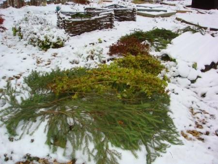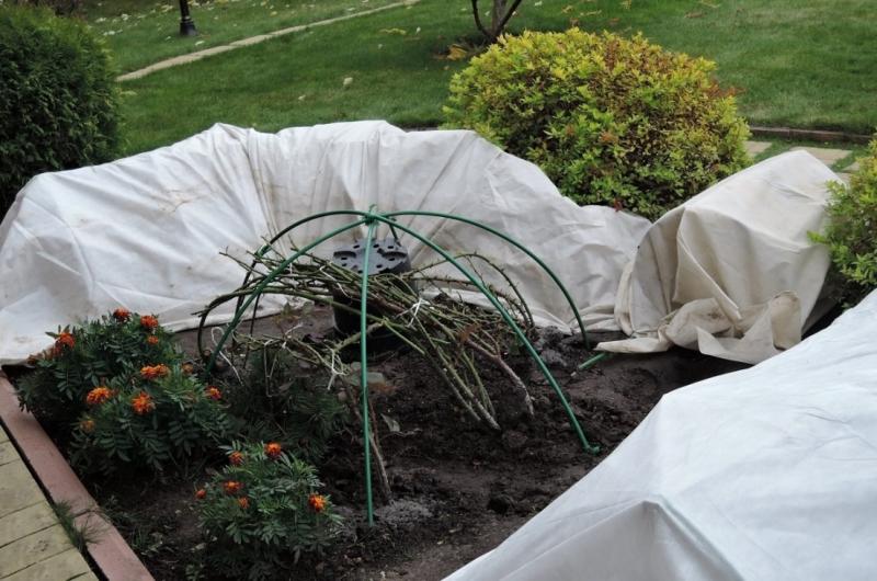 Для этого используют лапник, солому, агроволокно, либо оставшиеся после осенней обрезки ветки с листьями. Можно даже изготовить из прутьев и веревки некое подобие шалаша, а поверх него уложить лапник и надеть "колпак" из плотной воздухопроницаемой ткани.