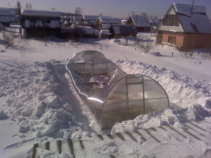 Каркасы теплиц, навесы из поликарбоната, «козырьки» над крыльцом и прочие конструкции такого рода с осени стоит дополнительно укрепить, поставив подпорки. А если есть возможность, снег с крыш неплохо бы счищать. Хлопотно, конечно, но часто спасает от гораздо больших хлопот и затрат.