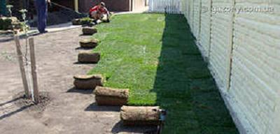 Газоны можно так же закладывать пластами дерна или посадкой побегов и корневищ. Перед укладкой дерна площадку тоже необходимо подготовить. Ее нужно выровнять, затем насыпать рыхлую, удобренную гумусом землю толщиной 2 – 3 см. После того как уложили дерн, полейте газон и затем постоянно поддерживайте влагу.