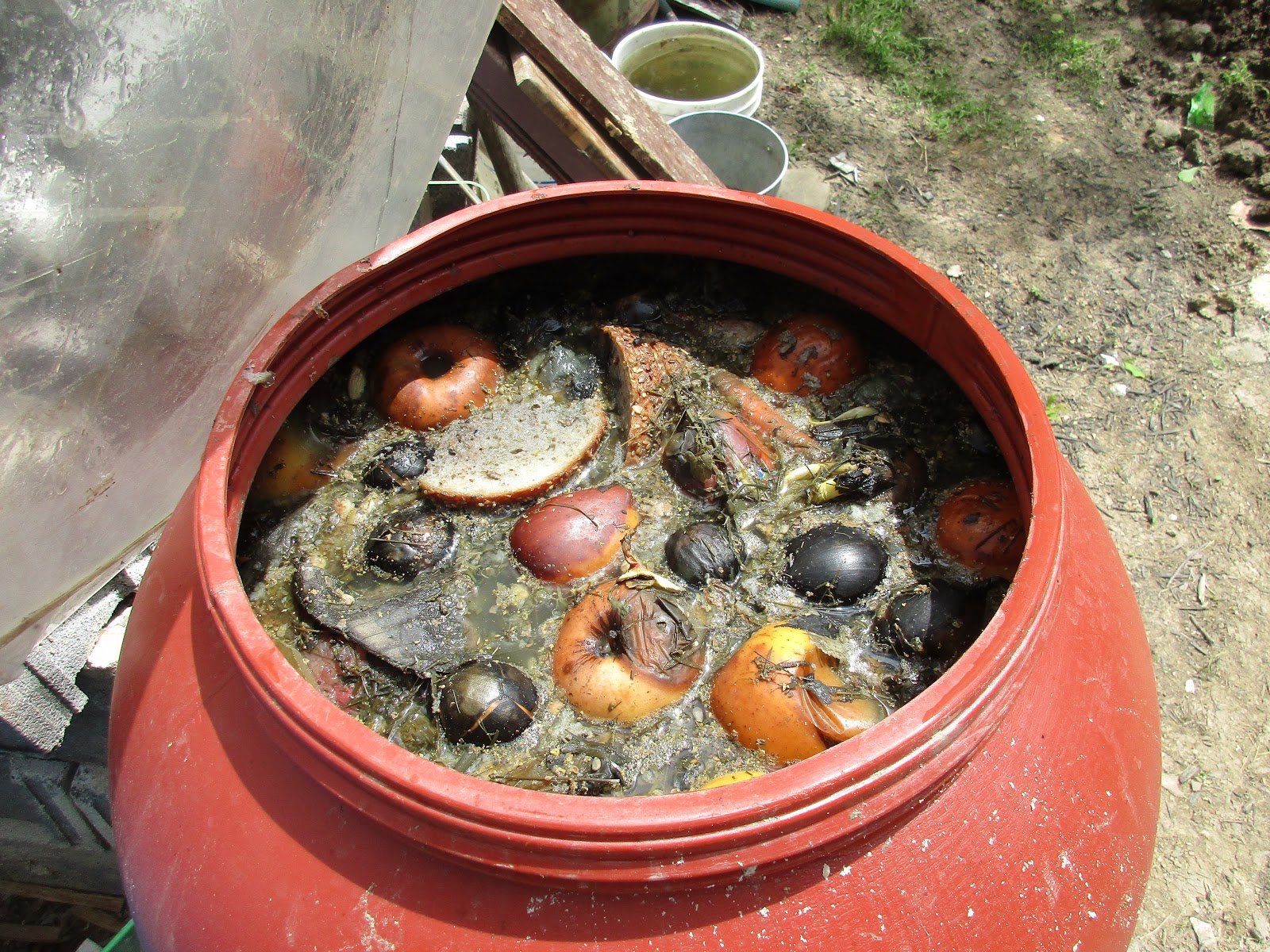 Примерно раз в неделю, хорошенько взболтав всю кашу со дна-откидываем лишнее на большой друшлаг,отжимаем-и в помойку. Вернее отжимки все упаковываем в целлофановые пакеты,и потом только в мусорку бросаем. А в бочку с перегноем бросаем всё больше и больше новых фруктов и овощей.