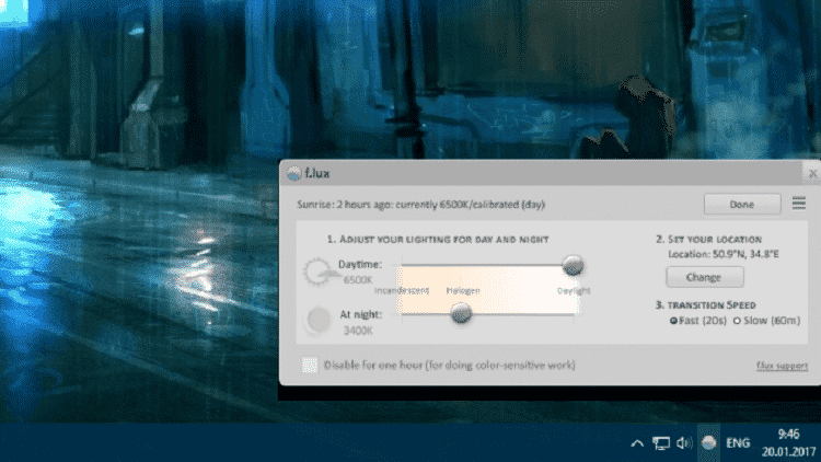 Крохотная, но оттого не менее полезная утилита f.lux подстраивает цвета дисплея под время суток. Вам нужно лишь указать свой населённый пункт и условия освещения. После этого f.lux будет снижать к вечеру яркость и интенсивность синего света, который, как известно, подавляет выработку гормона сна. Это поможет вам соблюдать правильный режим и уменьшит нагрузку на глаза.