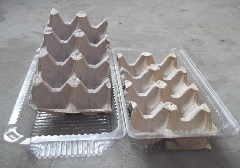 Налей в противень воды и размести на нём яичные лотки. Противень можно заменить пластиковыми коробками подходящих размеров.